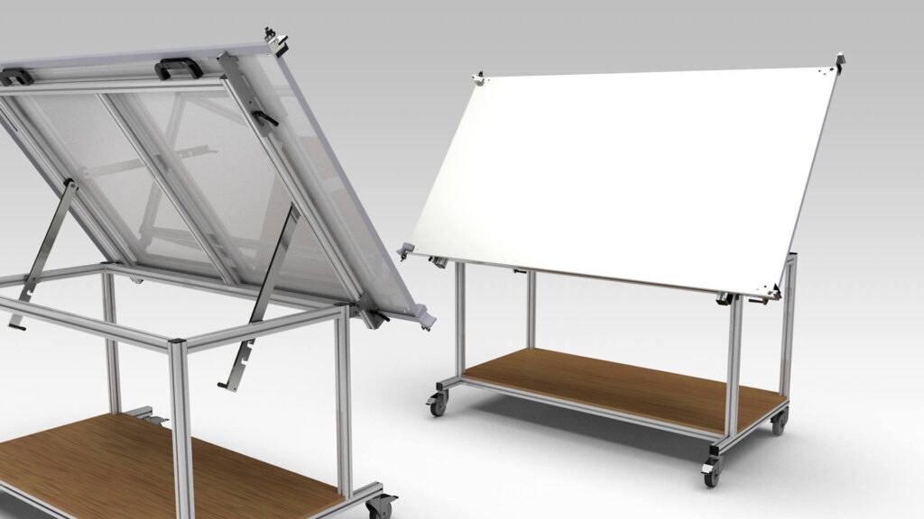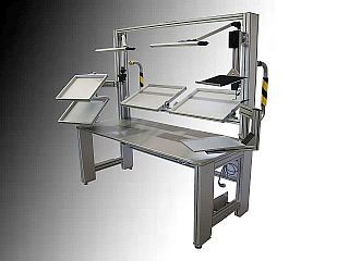 Normalerweise werden Produkte während der Fertigung auf den Tisch gelegt und in gebeugter Haltung bearbeitet. mit unserem Montagetisch kann die Arbeitsfläche auf 45° oder mehr geneigt werden. Der Antrieb für die Verstellung kann pneumatisch, elektrisch oder manuell gewählt werden. Die Aktivierung der zwei pneumatischen Zylinder erfolgt über eine Zwei-Hand-Betätigung.